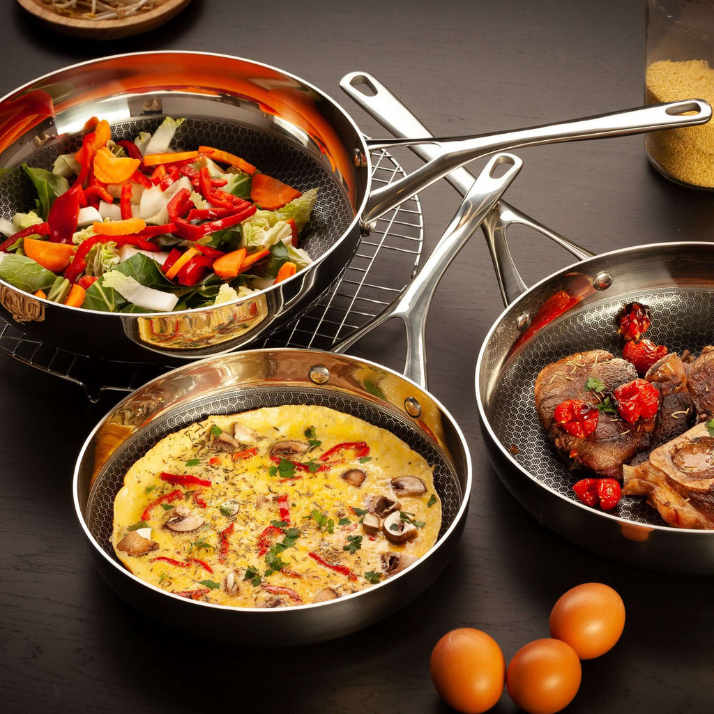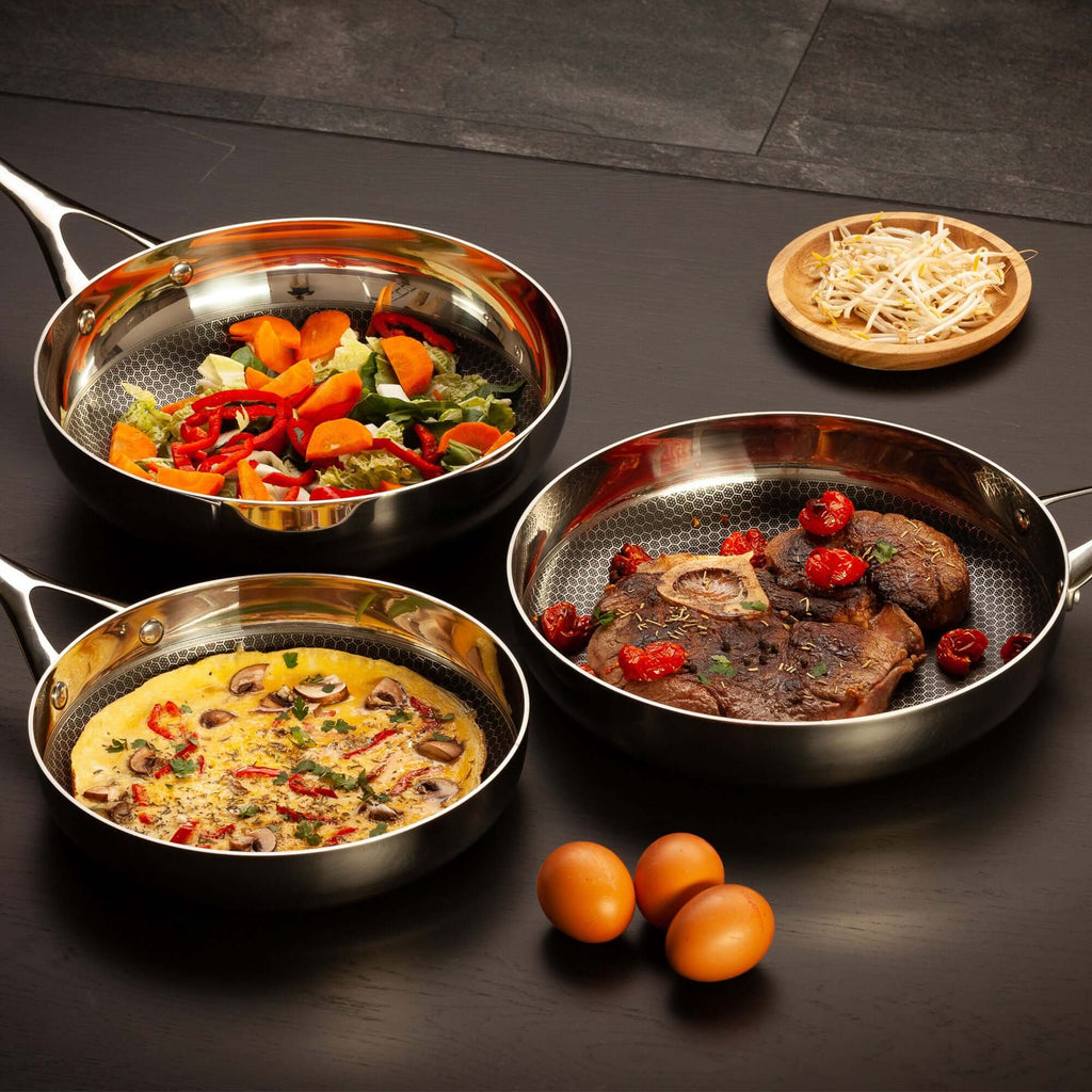 The Blackbeard Stainless Steel Frying pans and Wok - 24 + 28 cm + Wok 28 cm (9" + 11" + 11" wok)